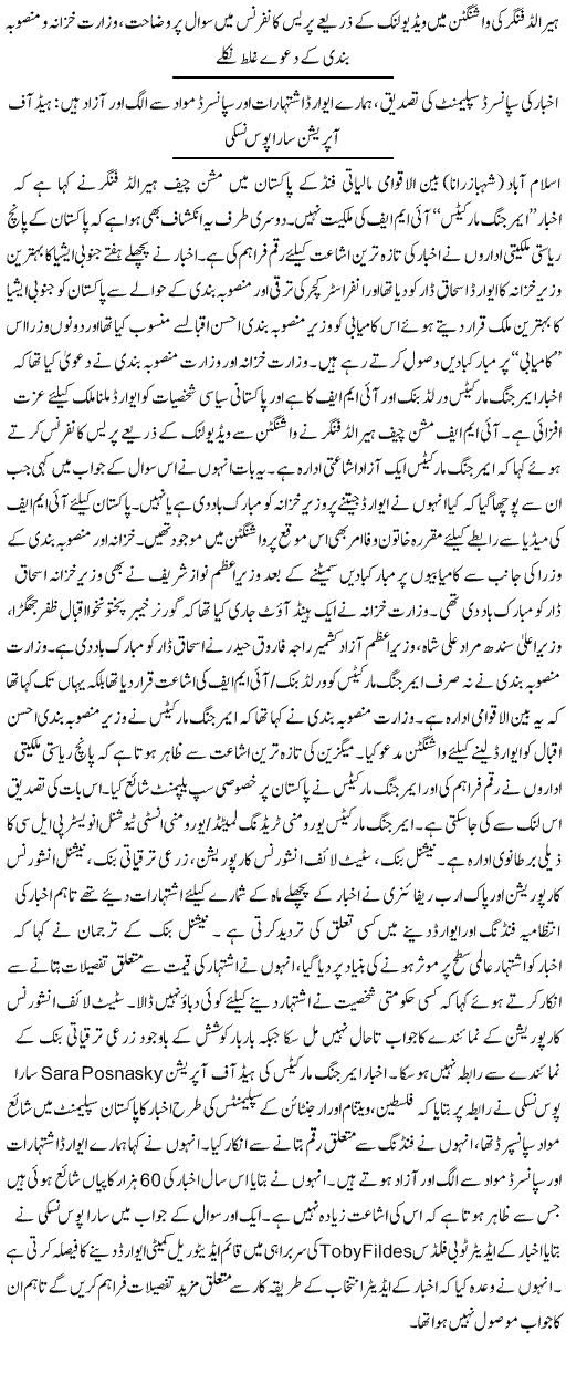 ISLAMABAD: The Emerging Markets newspaper does not belong to International Monetary Fund, said Harald Finger, the IMF’s Mission Chief to Pakistan on Thursday amid new revelations that five state-owned firms partially funded the publication’s latest edition.